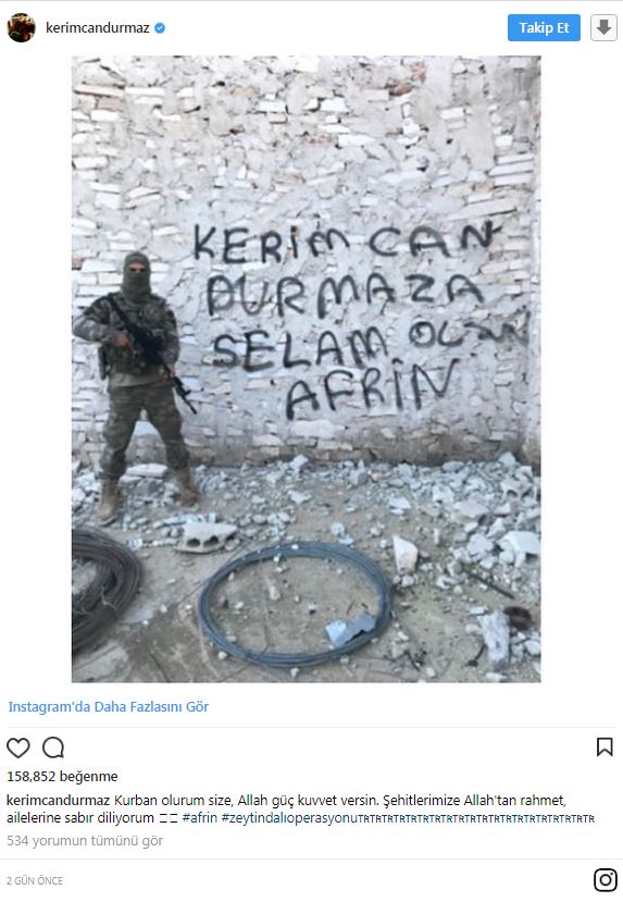 2,3 milyonun üzerinde takipçisi olan ünlü DJ Kerimcan Durmaz, sosyal medya hesabından Afrin'den kendisine gönderilen fotoğrafı paylaştı.