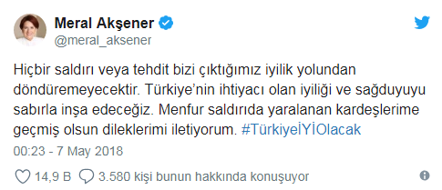 Akşener, Twitter’da olayla ilgili olarak “Hiçbir saldırı veya tehdit bizi çıktığımız iyilik yolundan döndüremeyecektir. Türkiye’nin ihtiyacı olan iyiliği ve sağduyuyu sabırla inşa edeceğiz. Menfur saldırıda yaralanan kardeşlerime geçmiş olsun dileklerimi iletiyorum. #TürkiyeİYİOlacak” dedi.