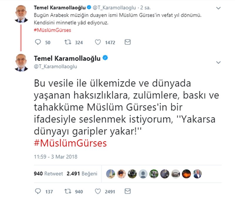 Karamollaoğlu mesajında, “Bugün Arabesk müziğin duayen ismi Müslüm Gürses’in vefat yıl dönümü. Kendisini minnetle yâd ediyoruz. Bu vesile ile ülkemizde ve dünyada yaşanan haksızlıklara, zulümlere, baskı ve tahakküme Müslüm Gürses’in bir ifadesiyle seslenmek istiyorum, ‘Yakarsa dünyayı garipler yakar!'” ifadelerine yer verdi.