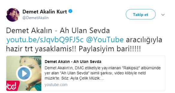 Akalın diğer bir paylaşımında ise, yasağa konu olan şarkısını yayınlayarak, "Hazır TRT yasaklamış! Paylaşayım bari!" ifadelerini kullanmıştı.
