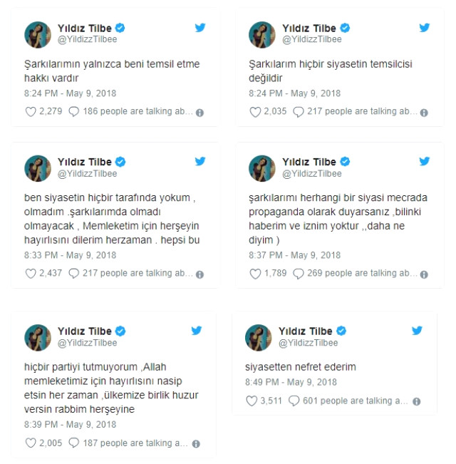 Ön anlaşmanın yapıldığı iddialarının ortaya atılmasından sonra Twitter hesabından açıklama yapan Yıldız Tilbe, iddiaların gerçeği yansıtmadığını söyledi. Şarkılarının sadece kendisini yansıttığını söyleyen Tilbe, "Şarkılarım hiçbir siyasetin temsilcisi değildir. Şarkılarımı herhangi bir siyasi mecrada propaganda olarak duyarsanız, bilin ki haberim ve iznim yoktur." ifadelerini kullandı.
